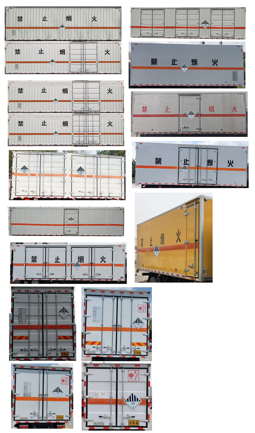 1、該車(chē)適用于危險(xiǎn)品運(yùn)輸,類(lèi)項(xiàng)號(hào):9。廂體頂部封閉,不可開(kāi)啟。2、側(cè)、后防護(hù)材料均為Q235,側(cè)防護(hù)螺栓連接;后防護(hù)焊接,截面尺寸120×50mm,下邊緣離地高450mm。3、僅采用軸距(mm):4700,5150。僅選用排氣管前置、限速裝置(限速80km/h)、前輪盤(pán)式制動(dòng)及子午線輪胎的底盤(pán);安裝帶有衛(wèi)星定位功能的行駛記錄儀;ABS系統(tǒng)型號(hào)/生產(chǎn)企業(yè)對(duì)應(yīng)關(guān)系:ABS-E/威伯科汽車(chē)控制系統(tǒng)(中國(guó))有限公司;ABS/ASR-24V-4S/4M/東科克諾爾商用車(chē)制動(dòng)系統(tǒng)(十堰)有限公司;CM4XL-4S/4M/廣州瑞立科密汽車(chē)電子股份有限公司;3550D-1010/東科克諾爾商用車(chē)制動(dòng)系統(tǒng)(十堰)有限公司.采用的發(fā)動(dòng)機(jī)與油耗值(L/100Km)對(duì)應(yīng)關(guān)系為:F4.5NS6B220/24.4,B6.2NS6B210/26。該車(chē)轉(zhuǎn)向輪安裝輪胎爆胎應(yīng)急防護(hù)裝置,后軸采用空氣懸架。該車(chē)型可選裝ETC車(chē)載裝置.隨底盤(pán)選裝駕駛室。廂體側(cè)面選裝開(kāi)門(mén)型式及位置,選裝不帶側(cè)開(kāi)門(mén),選裝瓦楞板或平板結(jié)構(gòu);廂體側(cè)面板選裝開(kāi)百葉窗。選裝后尾板時(shí),后防護(hù)材料為Q235,焊接,截面尺寸120×50mm,下邊緣離地高450mm。尾板收起狀態(tài)水平長(zhǎng)度為290mm,尾板質(zhì)量為550kg。選裝制冷機(jī)組,選裝燃油箱,電瓶,尿素罐,后處理,儲(chǔ)氣筒左右安裝位置。