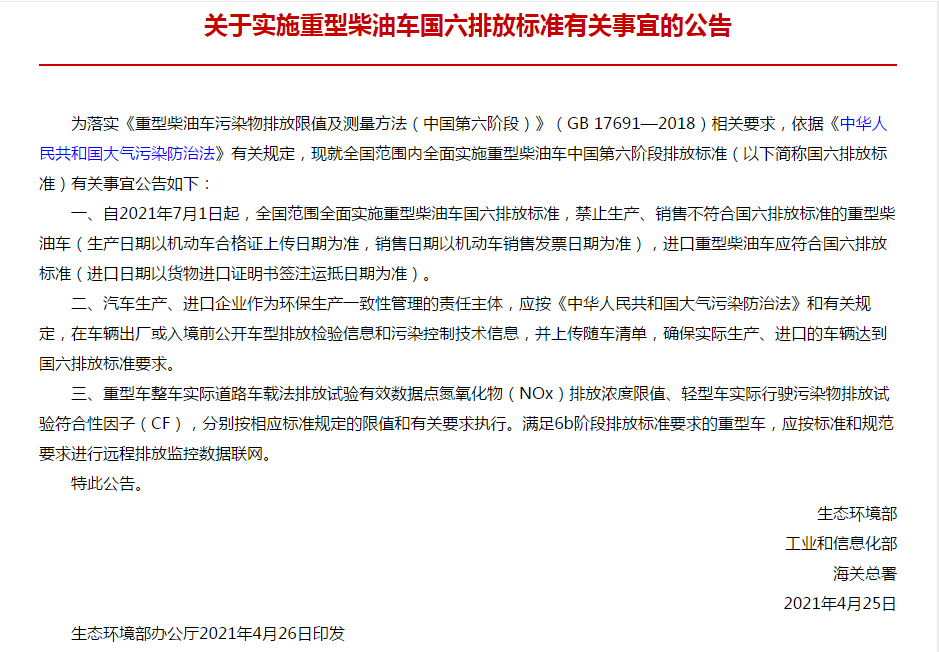 2021年4月26日,**生態(tài)環(huán)境部、工業(yè)和信息化部、海關(guān)總署印發(fā)《關(guān)于實(shí)施重型柴油車國(guó)六排放標(biāo)準(zhǔn)有關(guān)事宜的公告》(公告 2021年 第14號(hào))。